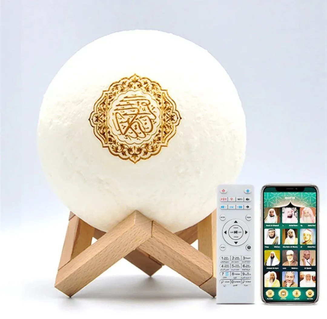 مصباح قمر القرآن الذكي يوفر إضاءة ناعمة ويتيح التحكم عبر جهاز التحكم عن بُعد، مع إمكانية الاستماع لتلاوات القرآن والأناشيد الإسلامية.